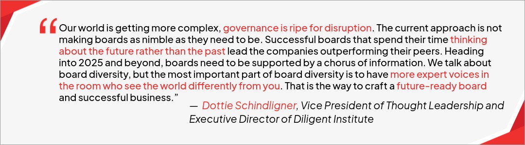 As we head into an uncertain year, Dottie Schindlinger, Executive Director of the Diligent Institute & Co-Host of The Corporate Director Podcast, summarizes the feelings of organizational leaders to predict the major board and governance trends of 2025.